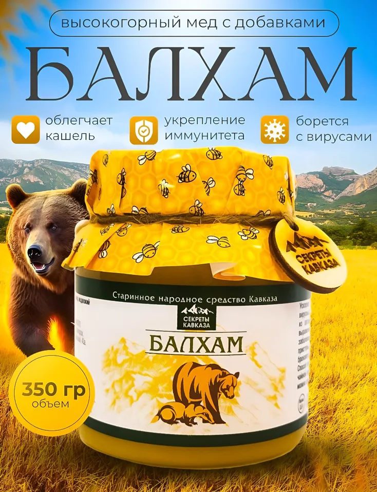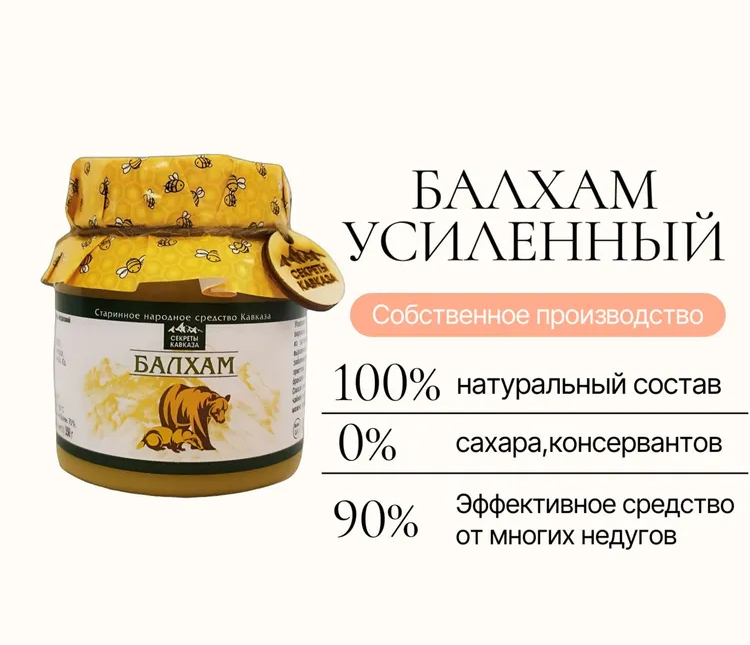 Старинное народное средство Кавказа, которое готовится по карачаевскому рецепту путем смешивания природных ингредиентов. В древние времена его использовали при многих недугах, благодаря чему и славился карачаевский народ своим долголетием и крепким здоровьем. В состав этого чудодейственного бальзама входят только натуральные компоненты, которые собираются в высокогорьях Кавказа. Познакомьтесь с удивительным усиленным балхамом – натуральным цветочным горным медом, который поражает своим вкусом и полезными свойствами. Этот мед, произведенный на Кавказе, стал настоящим народным средством, известным своими целебными качествами. Его уникальная формула включает в себя натуральные ингредиенты, что делает его идеальным выбором для тех, кто ищет полезные продукты без добавления сахара. Каждая баночка этого меда весом 350 граммов наполнена исключительно природными компонентами, которые сохраняют все богатство природы. Цветочный горный мед обладает ярким ароматом и насыщенным вкусом, напоминающим о солнечных лугах Кавказа. Уникальные свойства этого меда помогают укрепить иммунитет, улучшить общее состояние организма и зарядить вас энергией. Балхам подходит для использования в качестве добавки к теплым напиткам, десертам или как компонент здорового завтрака. Его можно размешивать в чае, использовать для приготовления домашней выпечки или просто наслаждаться ложечкой меда, чтобы ощутить его удивительный вкус и пользу. Этот мед не только вкусен, но и действительно полезен. Лечебные свойства горного меда прекрасно сочетаются с традициями кавказской медицины, где натуральные продукты использовались на протяжении веков. Благодаря своему составу, он может помочь при простудах, укрепить здоровье в сезон эпидемий и улучшить общее состояние организма. Не упустите возможность добавить этот лечебный мед в ваш рацион. Условия хранения От 0 С до +30 С при относительной влажности воздуха не более 75 % Состав: Мёд, прополис,барсучий жир ,медвежий жир,живица хвои.