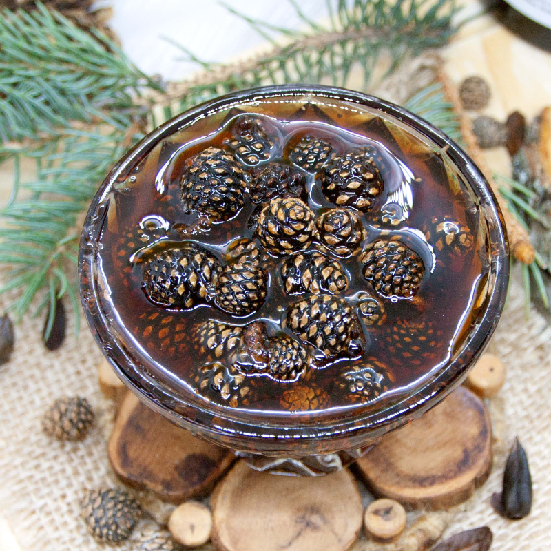 Шишка мягкая и полностью съедобная. Этот продукт можно описать одним предложением: варенье со вкусом тайги. Хвойный аромат уводит в глубь сибирских лесов и погружает в лесную сказку. «Живичным», «сосновым медом» издревле сибирские хозяйки называют варенье из молодых шишек таежной красавицы-сосны. Давно известно это лакомство как средство от многих болезней. Так, молодые сосновые шишки и отвары из них хорошо разжижают кровь, их рекомендуют употреблять для предупреждения инсульта. Компоненты, содержащиеся в этом природном лекарстве, придают силы и способствуют повышению иммунитета. Вкус у «Варенья из сосновых шишек» глубокий: фруктово-ягодный с хвойными и клубничными оттенками. Хранить в прохладном месте, без попадания прямых солнечных лучей. После вскрытия хранить в холодильнике при температуре от +2°С до +6°С Состав: сахар, вода, сосновые шишки.