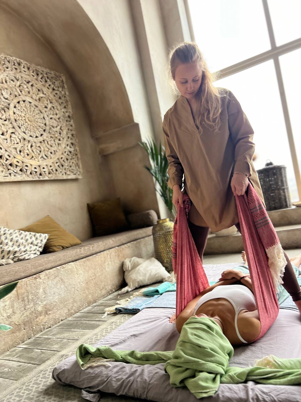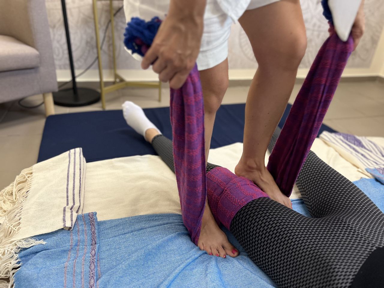 Это уникальная процедура и практика для России. В Тае это массаж называют Pha Knaw Mah, в нем используют традиционное тонкое хлопковое полотенце. В основу этого массажа легли: биомеханика Тайского массажа, традиции медицины разных стран и некоторые элементы из массажа «Ребозо». Основными зонами для проработки а 100-минутном массаже являются шея, спина, плечевые суставы, таз, живот, ноги. Наш специалист коммуницирую с Вами выясняет наиболее проблемные зоны/зажимы, учитывает пожелания, проявляя индивидуальный подход. Благодаря полотнам все движения становятся длинными, плавными и глубокими. Вы ощутите полное расслабление. Можно крайне деликатно, но в то же время глубоко проработать грудную клетку и живот. Полотна являются прекрасной поддержкой при работе стопами. В результате Вы получаете раскрытое тело и спокойный ум.
